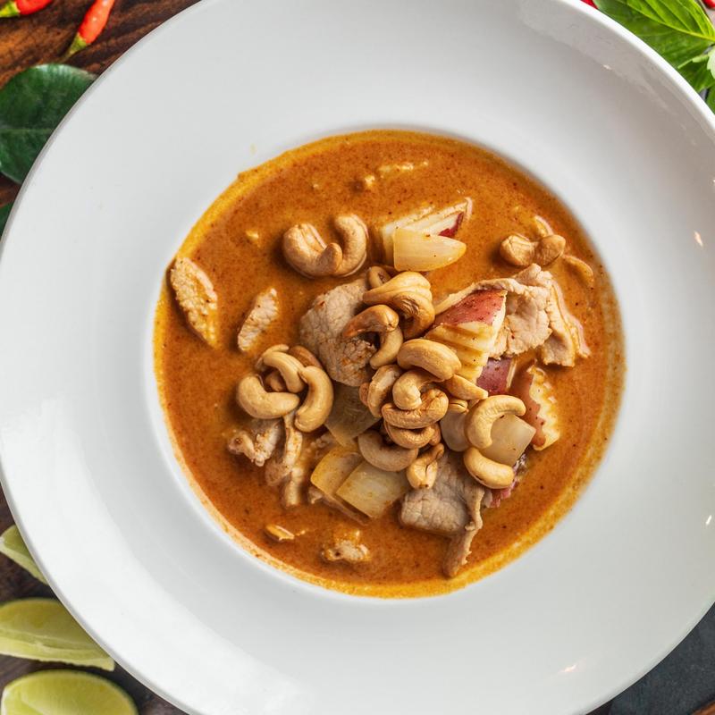 Pork, Tofu, Veg $14.95 | Beef, Shrimp, Calamari $15.95 | Organic Chicken $18.00 • Named the Best Food in the World by CNN | Onion, red potato, cinnamon, star anise, and bay leaf in Massaman curry sauce infused with coconut milk, topped with cashew nut