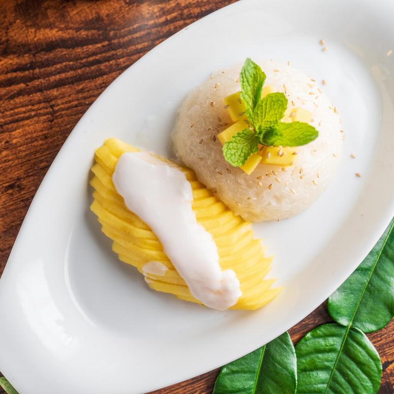 Tantalizing Thai dessert that will transport your taste buds to tropical bliss: fragrant sticky rice infused with creamy coconut milk, paired with ripe mango slices and topped with toasted sesame seeds