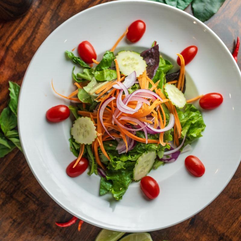 Mixed organic greens with tomatoes, cucumbers, onion, carrots, and mushrooms served with peanut dressing