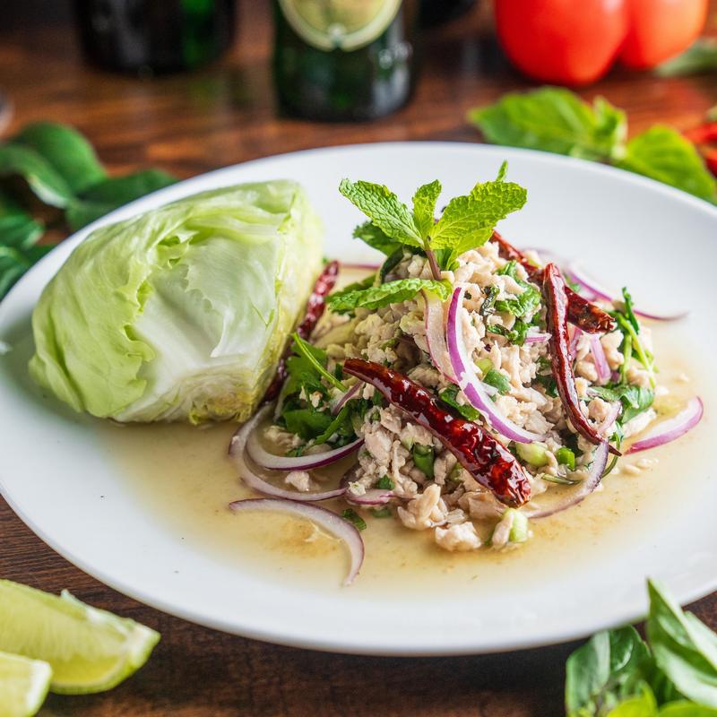 Minced chicken marinated in lime dressing, hot chili, sliced red onion, cilantro, mint, scallion, roasted rice powder, served with fresh lettuce or cabbage