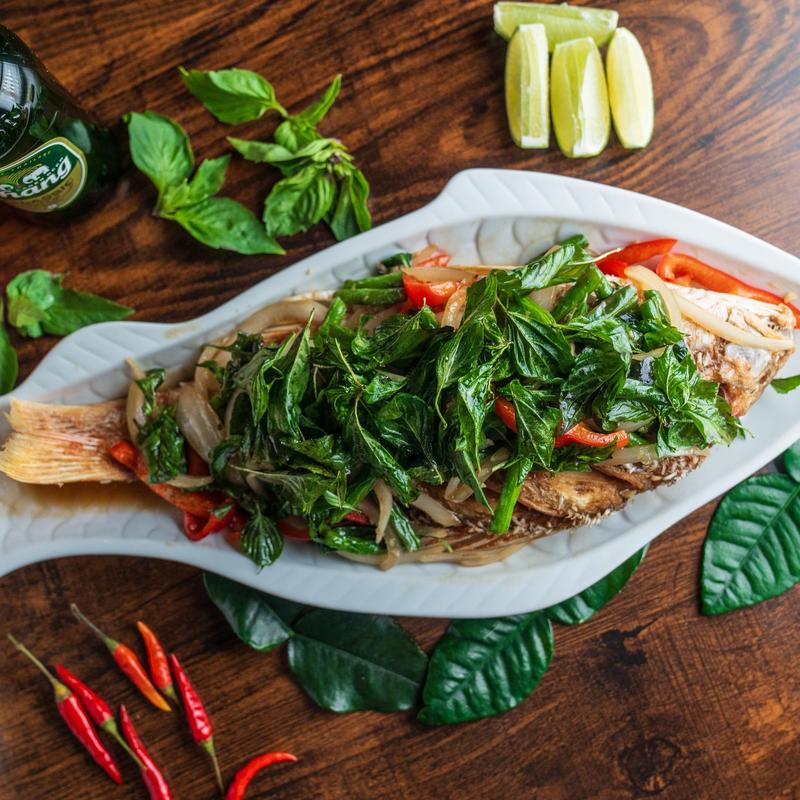 A delightful encounter with a crispy whole red snapper elevated with a luscious basil sauce, a must-try for Gra-Pow lovers (Thai basil)