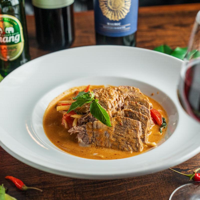 Encapsulates the essence of Thai cuisine with delectable flavors and vibrant colors: boneless duck in red curry with red bell pepper, pineapple, snow pea, tomato, and basil